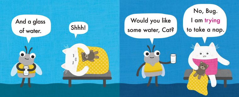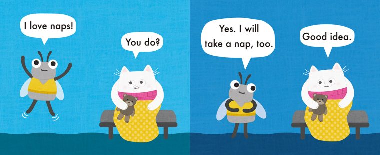 In this story in the Cat and Bug series of full-color board books about Cat and his obliviousfriend Bug, Cat is trying to take a nap. Bug decides to take a nap, too, but Bug’s preparations for naptime are keeping Cat awake. Bug may have a lot to learn but his friend Cat loves him anyway. This amusing beginner book, with bold, bright illustrations and simple text will show the readers how to prepare for naptime and the importance of patience. Introduces young readers to simple vocabulary and dialogue.